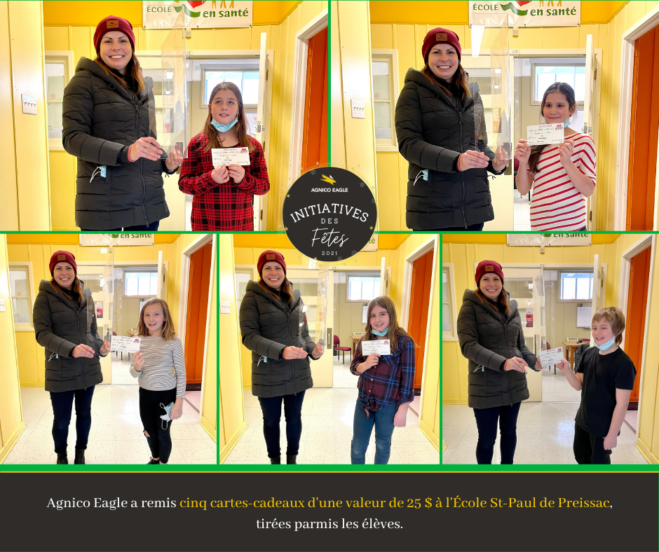 Pour conclure cette série d’initiatives réalisées dans le cadre du temps des fêtes, l’Association récréative régionale de l’Abitibi-Témiscamingue chez Agnico Eagle a remis plus d’une cinquantaine de cadeaux pour enfants aux organismes suivants : service de 1re ligne du Conseil de la Première Nation Abitibiwinni, maison de la famille de Val-d’Or, banque alimentaire de Malartic, maison Mikana d’Amos, ainsi qu’aux écoles de Preissac et Cadillac.