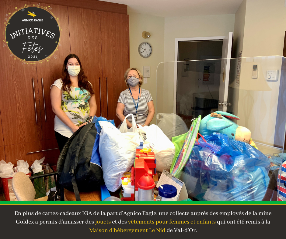 Enfin, une initiative en trois volets propres à Goldex fut mise en œuvre pour aider les plus vulnérables grâce à la générosité de ses employés. Le premier a pris la forme d’une collecte de vêtements, de jouets et de produits d’hygiène pour la Maison d’hébergement Le Nid de Val-d’Or afin d’égayer la période des Fêtes des femmes victimes de violence conjugale ainsi que leurs enfants. Le deuxième consiste en une collecte de manteaux, bottes et accessoires d’hiver qui ont été remis à La Piaule de Val-d’Or afin d’être redistribués à des personnes en situation d’itinérance. Le besoin pour La Piaule était tel qu’Agnico Eagle et les Nettoyeurs sigma ont remis plus d’une quarantaine de manteaux d’hiver neufs à l’organisme provenant de leur inventaire d’articles promotionnels. Finalement, parce que tout le monde mérite une petite douceur pendant le temps des Fêtes, un brunch de Noël a été offert par Goldex aux usagers de La Piaule de Val-d’Or.